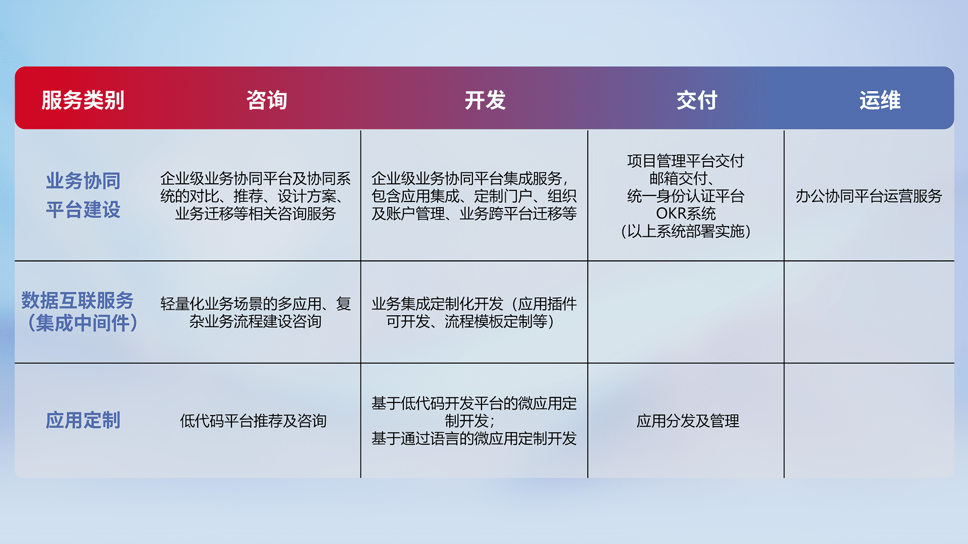 针对钉钉、、、、企微、、IDaas等平台级产品提供产品的规划、、、方案、、、交付、、定制化开发等服务,,,实现如统一协同办公、、智能客户服务、、、、混合会议管理、、智能数据查询、、等业务场景,,实现数字化转型。。。