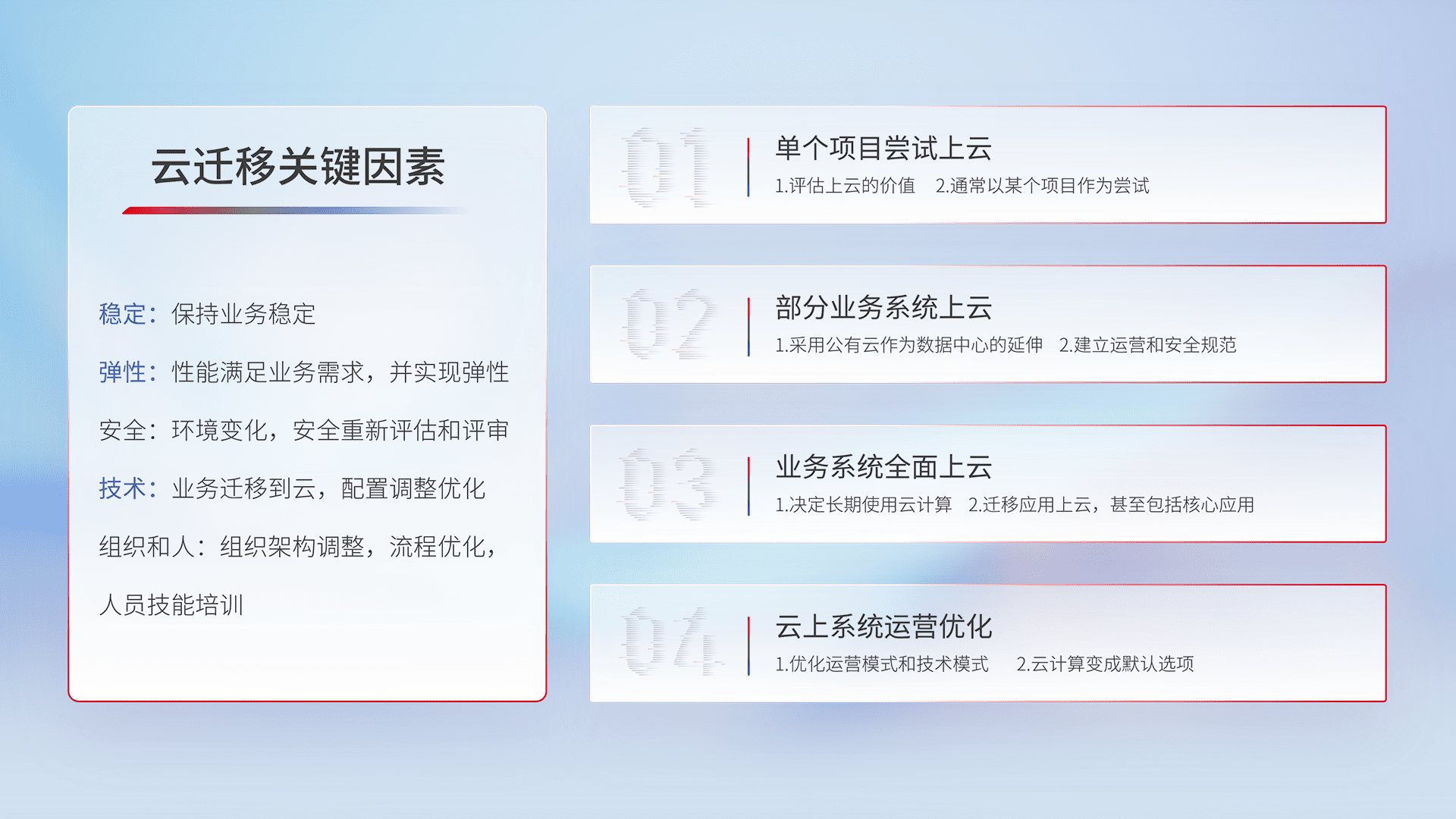 结合实际业务,,,,从规划设计、、、云平台选型、、、云原生改造、、、、数据迁移、、集成交付,,迁移全过程为客户识别最佳上云路径,,,做好风险识别管理,,设计网络架构、、身份权限、、安全审计合规、、、操作审计、、日志审计、、、监控告警策略、、多站点容灾设计等,,,,对云上基础设施进行整体规划,,提升IT治理水平,,以满足弹性、、、高可用、、高性能的需求。。。