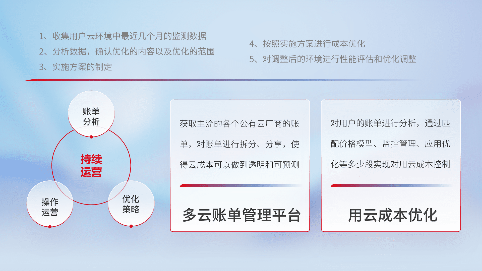 通过多云纳管,,以统一的资源数据模型把客户的云资源进行抽象和封装,,,,进而实现对多云资源的统一操作,,,,保障云资源管理的可靠性、、、、稳定性与可用性。。。。量身定制化运维内容,,,,配置、、开发运维、、、、补丁管理、、、、备份、、、监控、、、、认证和访问管理、、、审计和日常巡检等,,保障在用云过程中的可靠度,,,,稳定度以及高可用率。。